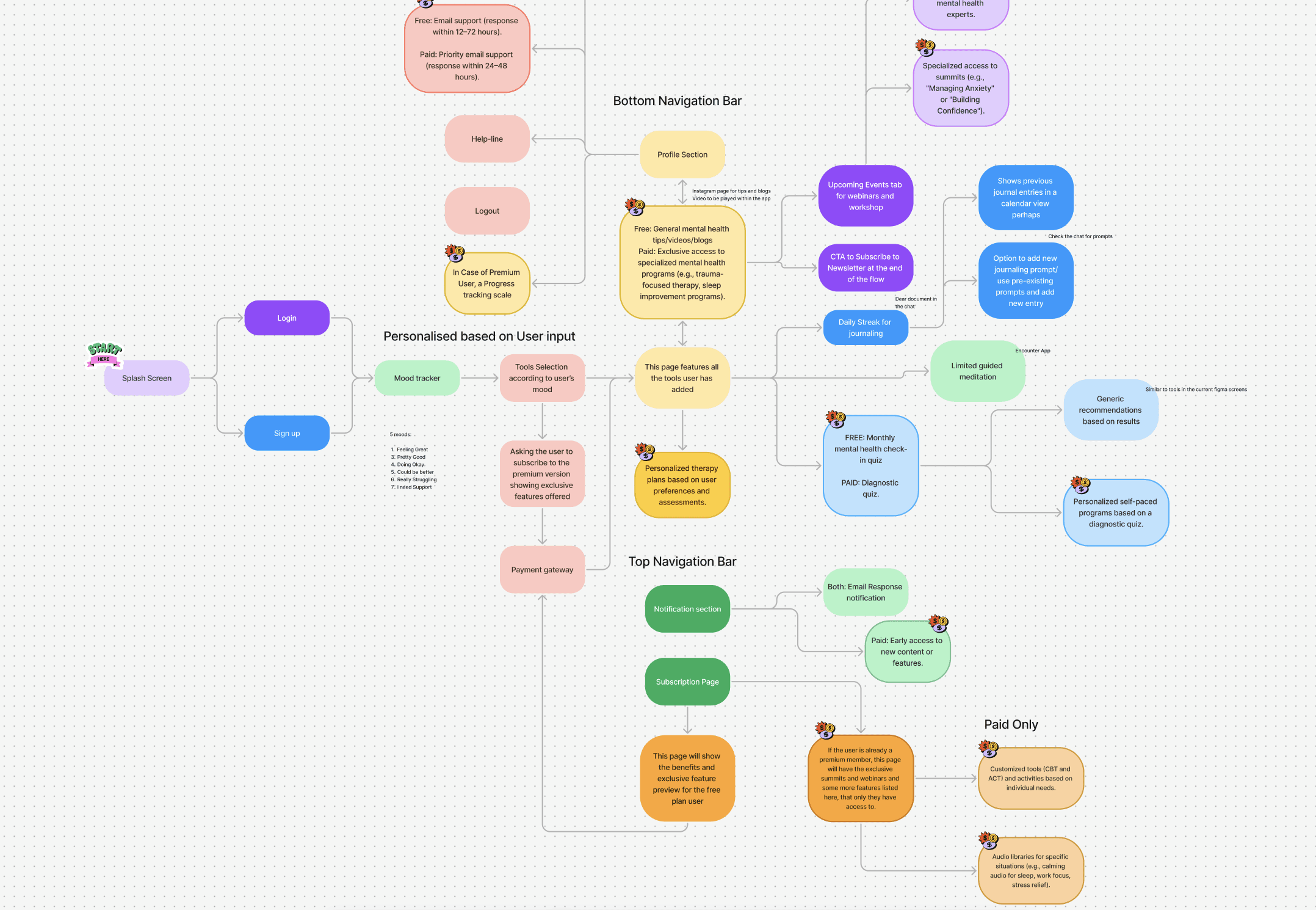 The app experience starts with a calming onboarding flow where users log in and select their current mood. Based on their emotional state, from feeling great to really struggling, the app guides them through reflective prompts, therapy tools, or their progress dashboard.